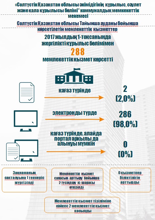 «Солтүстiк Қазақстан облысы Тайынша ауданының құрылыс, сәулет және қала құрылысы әкiмдiгiнiң бөлiмi» КММ мемлекеттiк қызметтер көрсету мәселелерi бойынша есебi