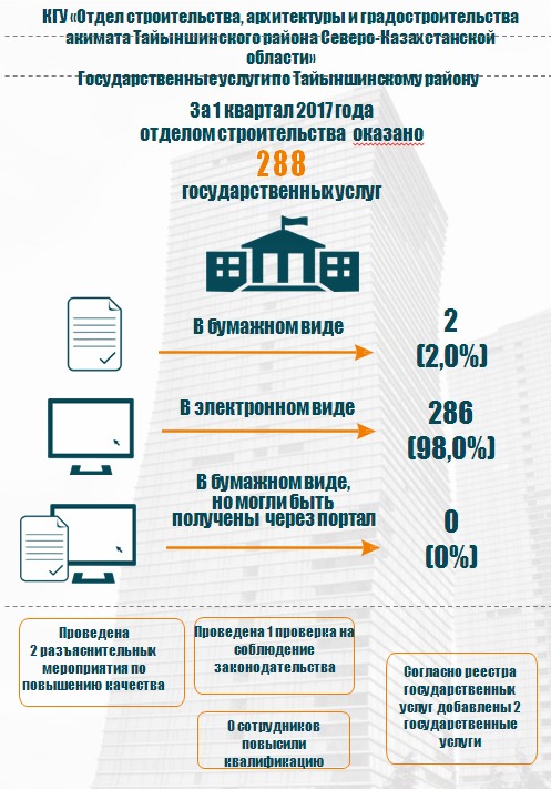 КГУ «Отдел строительства, архитектуры и градостроительства акимата Тайыншинского района Северо-Казахстанской области» за 2017 год оказано 943 государственные услуги.